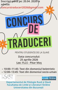 Departamentul de Filologie Rusă și Slavă, din cadrul Facultății de Limbi și Literaturi Străine a Universității din București, invită studenții pasionați de limbile slave să participe la Concursul de traduceri pentru studenți, ca o oportunitate excelentă de a-și demonstra abilitățile lingvistice și de a dobândi experiența, atestată prin eliberarea unui certificat și a unei adeverințe, ce pot fi atașate la dosarul personal și luate în considerare pentru efectuarea practicii profesionale sau pentru portofoliul de traducere.