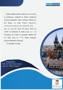 Секція української мови та літератури Факультету іноземних мов і літератур Бухарестського університету запрошує взяти участь у відкритій лекції, яку проведе Алла Антофійчук, доцент кафедри сучасної української мови Чернівецького національного університету імені Юрія Федьковича, дослідниця епістолярію Буковини кінця ХІХ – ХХ ст.